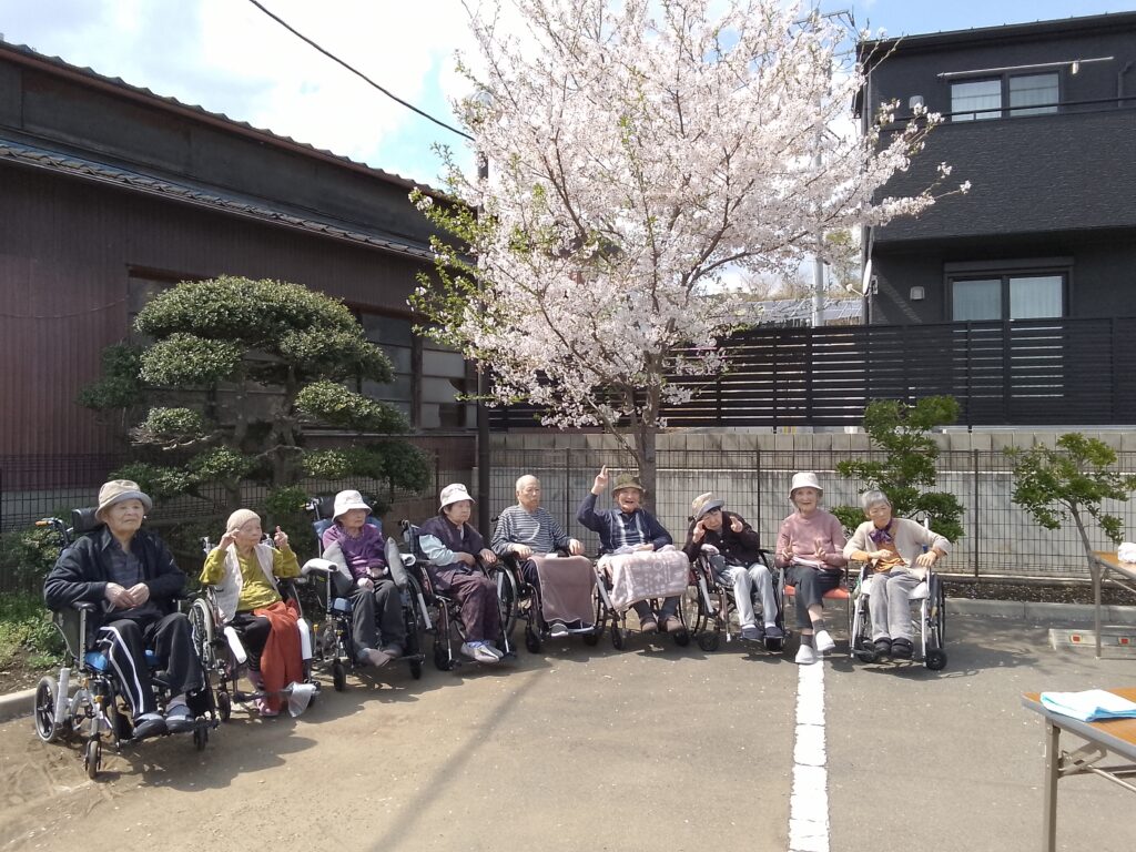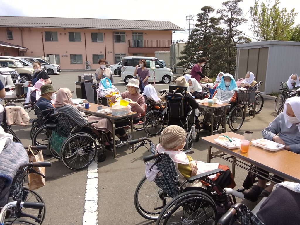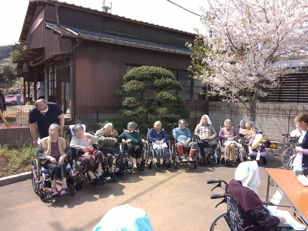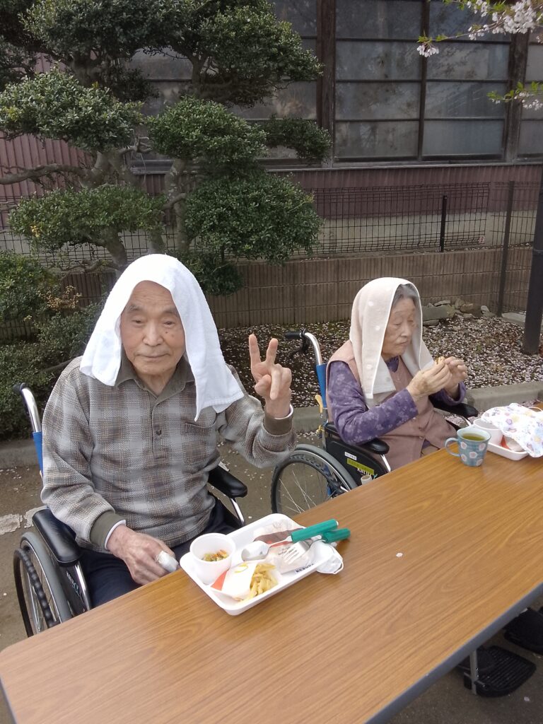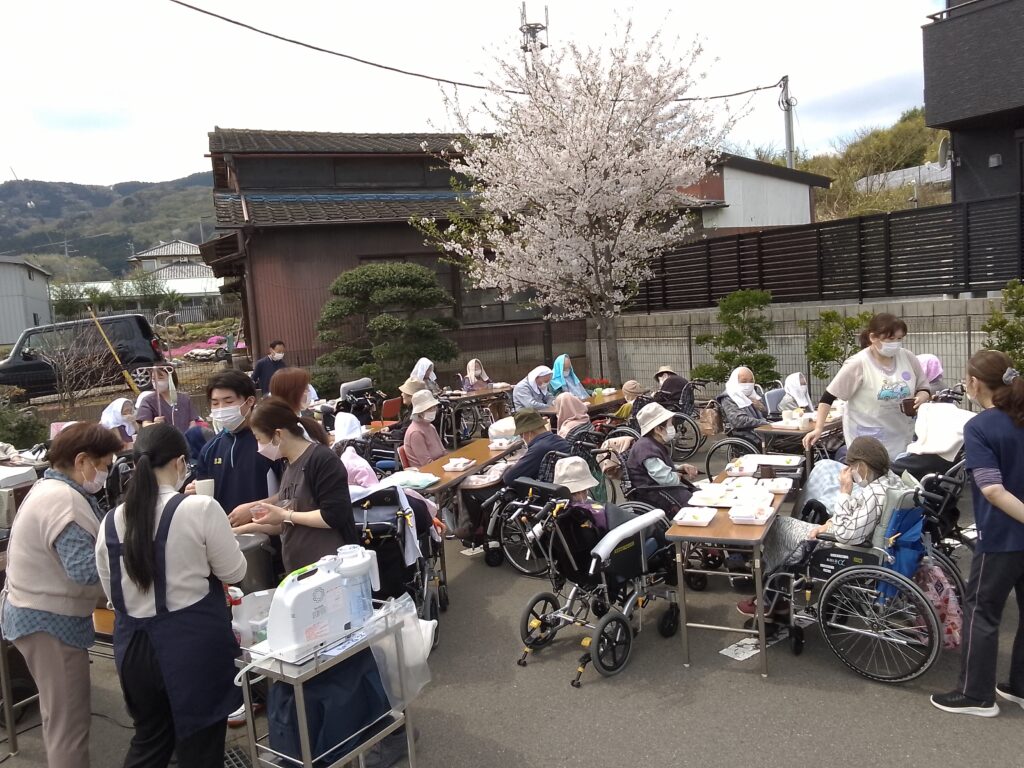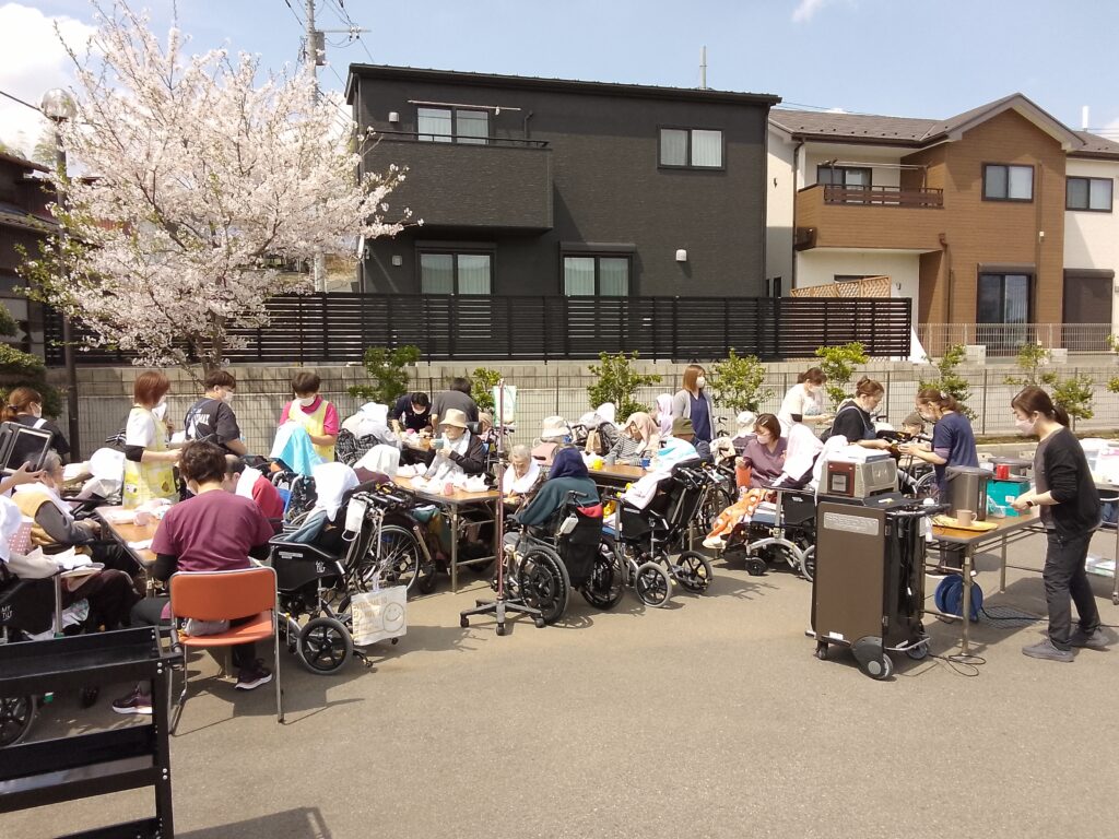本日はご利用者様、入居者様でお花見をしながら昼食を召し上がりました。しばらく天気の悪い日が続いていたので心配していましたが職員の願いが届いたのか(?)気持ちの良い晴れとなりました。昼食はマクドナルドさんでハンバーガーとポテトを購入し、施設で食べやすいように盛り付けてから提供致しました。ハンバーガーを提供するのは初めての試みでしたが「久しぶりに食べるね」と皆様にも美味しく召し上がって頂きました。施設の桜も満開を少し過ぎた位ですが青空の下で綺麗に咲いていました。